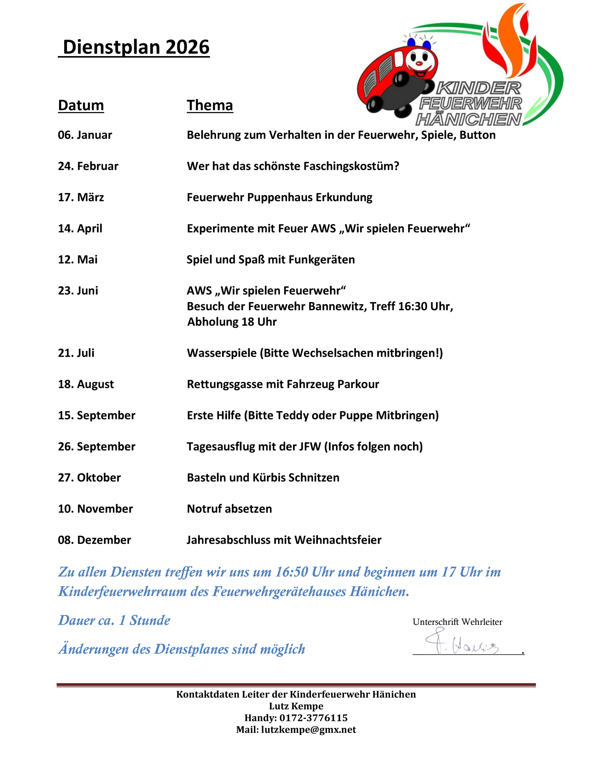 Alle Dienste beginnen um 17 Uhr im Kinderfeuerwehrraum des Feuerwehrgerätehauses Hänichen und dauern 1 Stunde.